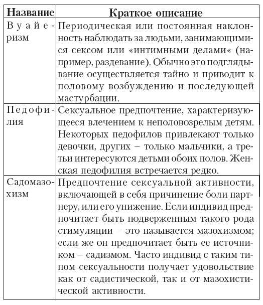 Не нужно смущаться, если у вас отмечаются некоторые элементы каких-то из перечисленных в таблице сексуальных предпочтений, большинство из них коренится во вполне естественных и нормальных реакциях. Рекламные кампании нижнего белья не даром акцентируют внимание на его сексуальности, а просмотр порнографической видеопродукции мало чем отличается от вуайеризма. Однако, если подобные склонности становятся преобладающими, если они оказываются непременным условием сексуального удовлетворения, то, вероятно, вам потребуется помощь специалиста – психотерапевта или сексолога.
