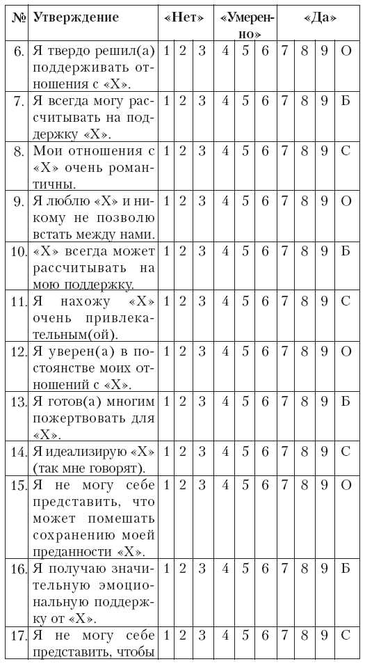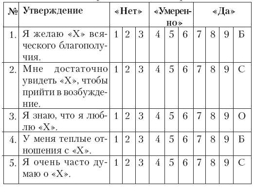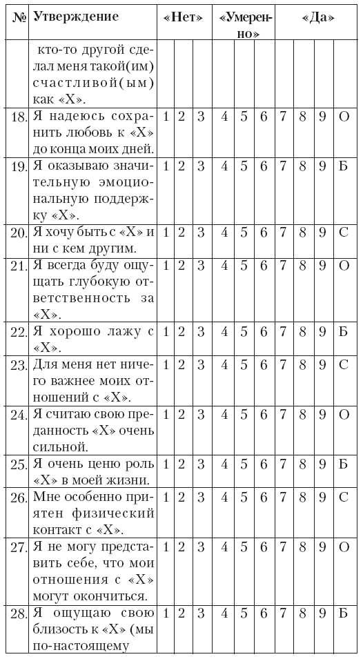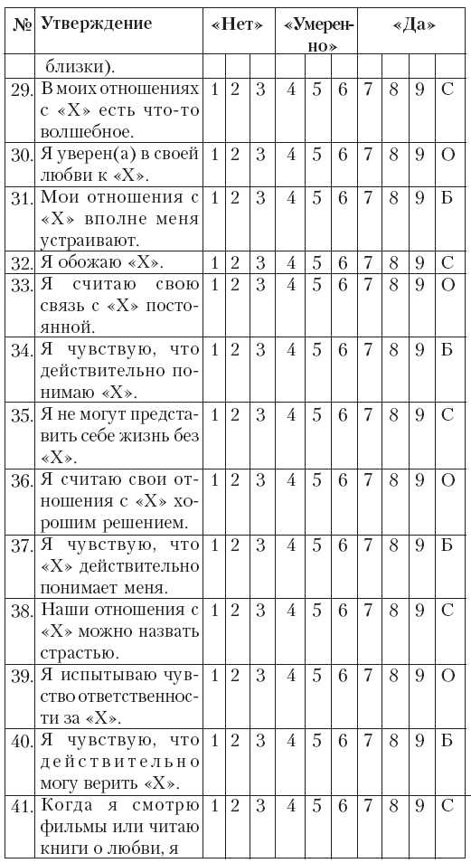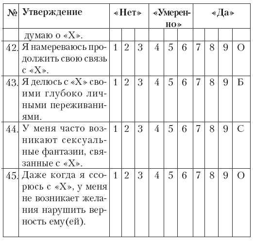Далее следует 45 позиций, которые вам следует оценить по шкале от 1 до 9, где 1 означает «совсем нет», 5 —«умеренно» и 9 – «очень сильно». Делая выбор, подставляйте в утверждениях на место мистера или миссис «Х» имя того человека, свои отношения с которым вы считаете любовными, и которые вы бы хотели проэкзаменовать.