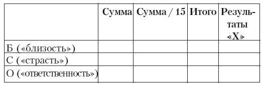 Теперь просуммируйте в отдельности ответы в графах Б («близость»), С («страсть») и О («ответственность»), а потом разделите каждую из полученных сумм на 15. Полученные данные занесите в следующую таблицу.