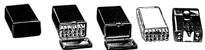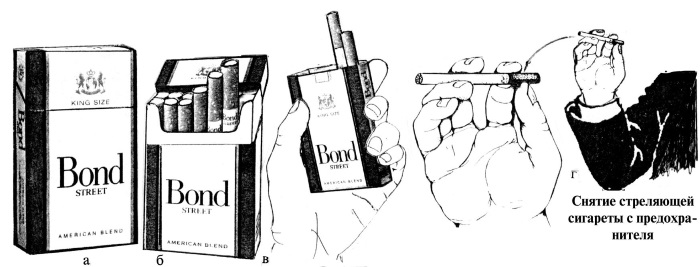 На рисунке 281 — пистолет-перчатка. Он предназначается для проникновения на строго охраняемые объекты и устранения охранников. Пистолет представляет собой плоское устройство из стальных пластин со стволом, снаряженным достаточно мощным (9,6 мм) револьверным патроном. Стреляющее устройство крепится заклепками к толстой кожаной перчатке. Спусковой рычаг шептала ударника располагается в его передней части. Агенту стоит лишь сжать пальцы в кулак и ударить противника. При этом выступающий спусковой рычаг производит выстрел.