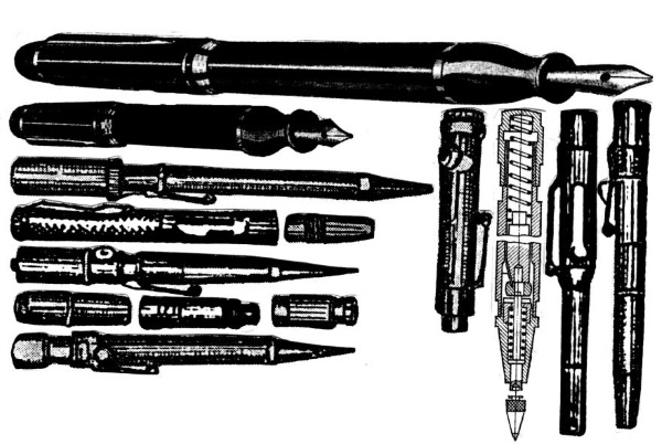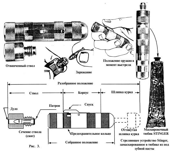 На рисунке 278 — стреляющее устройство, вмонтированное в каблук ботинка, является однозарядным оружием скрытого ношения, представляющее собой ствол с патроном, вмонтированным в каблук ботинка. Ствол расположен таким образом, что ударник несколько выступает из каблука. Для производства выстрела достаточно ударить каблуком о какую-либо преграду либо о другую ногу, направляя («целясь») при этом ствол в сторону объекта.