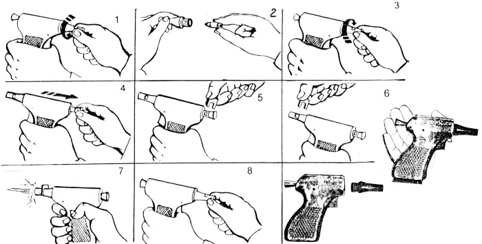 На рисунке 280 — пистолет на предплечье руки. Это оружие, которое располагается в рукаве пиджака таким образом, что кольцевой магазин находится около локтя, а ствол, прижатый ремешком к запястью, лежит вдоль руки. Для производства выстрела необходимо отвести кожух ствола вперед и нажать на спусковой рычаг. Это пистолет многоразового действия, обеспечивается магазином.