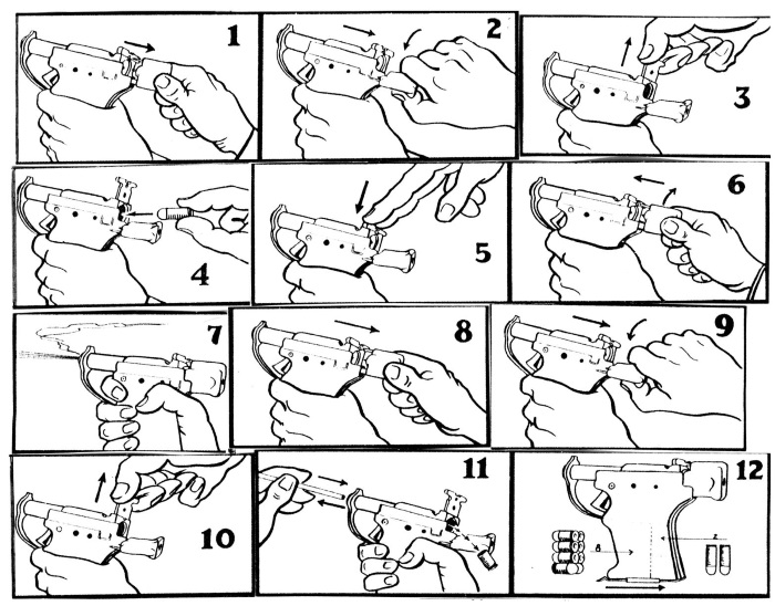 Нормально бойки отжимаются пластинчатыми пружинами от капсюлей, но при перемещении ползуна смонтированные в нем выступы под действием боевой пружины ударяют по бойкам, которые, в свою очередь, ударяют по капсюлям патронов. Перед стрельбой ползун смещен в крайнее левое положение (в нем бойки сдвинуты от его выступов) и удерживается головкой штока, с которой он жестко связан шепталом, расположенным перед головкой. Случайное опускание шептала (деблокировка головки штока) исключается предохранителем, подпирающим шептало снизу. После выключения предохранителя, которое производится оттягиванием предохранителя вверх с помощью присоединенного к нему шнурка, шептало может быть выведено из-под головки штока ползуна спусковым рычагом, левая часть которого шнурком присоединена к руке. Другим шнурком присоединен выключатель предохранителя. Таким образом, при подъеме руки вверх головка штока ползуна освобождается и шток вместе с ползуном (под действием боевой пружины) перемещается вправо, выступы ползуна взаимодействуют с бойками, производящими выстрелы из всех стволов.