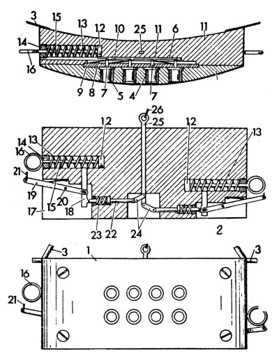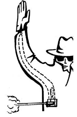 На рисунке 283 — пряжка-пистолет. При нажатии на кнопку лицевая часть пряжки отскакивает, стволы, вмонтированные в основание пряжки, выдвигаются и из них одновременно производятся выстрелы. Устройство монтируется в пряжке поясного ремня.