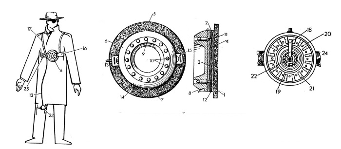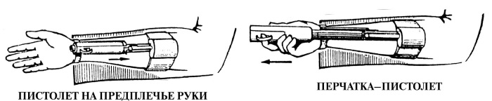 На рисунке 282 — плоский пистолет, маскируемый в пряжке поясного ремня. Выстрел производится с помощью дистанционного спускового механизма.