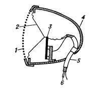 Рис. 8. Пьезоэлектрический микрофон (разрез): 1– защитный кожух; 2 — диафрагма; 3 — пьезоэлемент; 4 — корпус; 5 — кабель; 6 — выводы