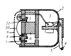 Рис. 9. Катушечный электродинамический микрофон (разрез): 1 — акустическое сопротивление; 2 — корпус; 3 — трансформатор; 4 — выводы; 5 — кабель; 6 — магнит; 7 — акустический канал; 8 — гофрированный воротник; 9 — защитный кожух; 10 — диафрагма; 11 — звуковая катушка