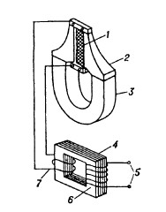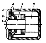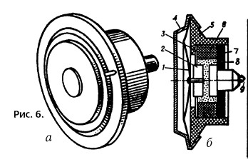 Рис. 10. Электродинамический микрофон катушечного типа: 1 — диафрагма; 2 — звуковая катушка; 3 — гофрированный воротник; 4 — магнитопровод; 5 — полюсный наконечник; 6 — магнит