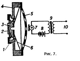 Разрез и схема включения в электрическую цепь угольного микрофона: 1 и 2 — подвижный и неподвижный электроды, подключаемые к электрической цепи; 3 — угольный порошок; 4 — корпус; 5 — защитный кожух; 6 — диафрагма; 7 — угольный микрофон; 8 — электрическая батарея питания микрофона; 9 — трансформатор; 10 — выводы трансформатора