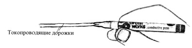 Если поверхность конструкции, на которой предполагается установка, ровная, твердая и гладкая, то можно воспользоваться другим инсталлятором — «Circuit works; Conductive Реп», внешне похожим на обычный фломастер, но с раздвоенным пишущим концом, вместо чернил он заправлен специальной жидкостью, содержащей соединения серебра. При проведении им линий на поверхности образуются визуально незаметные электропроводящие дорожки. Количества содержащейся в инсталляторе жидкости хватает на прокладку 50 метров токопроводящего пути (рис. 28).