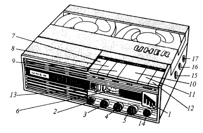 Рис. 38. Магнитофон «UHER»: 1 — кнопка «Переключение скорости»; 2 — ручка «Звук»; 3 — ручка «Тембр»; 4 — Ручка «Уровень записи»; 5 — ручка «Автоматическая настройка уровня»; 6 — стрелочный указатель уровня записи, 7– клавиша «Перемотка назад», 8 — клавиша «Пуск», 9 — клавиша «Пауза»; 10 — клавиша «Стоп»; 11 — клавиша «Запись»; 12– клавиша «Перемотка вперед»; 13 — цифровой счетчик метража пленки; 14 — встроенный микрофон; 15 — гнездо для подключения динамика; 16 — гнездо для подключения наушников; 17 — гнездо для подключения внешнего микрофона