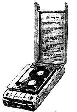 Отдельный класс представляют магнитофоны, специально разработанные в ЦРУ для своих агентов. Одним из них является упомянутый выше «Intelligence Case, Модеl SК-8А» (см. рис. 34), в котором магнитофон объединен с передатчиком. Он носится в стандартном кейсе «Royal Traveller». Магнитофон рассчитан на 6 часов непрерывной работы и может срабатывать от голоса или запускаться радиосигналом. Он имеет шнуры для подсоединения к электросети автомобиля (через прикуриватель) и к радиоантенне автомобиля (для использования ее как передающей) при ведении передачи из автомобиля (в том числе движущегося). Радиус действия передатчика — несколько миль.