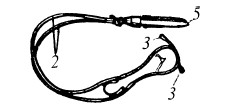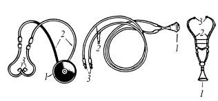 К рис. 3–5: Устройство стетоскопов — фонендоскопов: 1 — звукоприемная воронка; 2 — слуховые трубки; 3 — ушные наконечники; 4 — усиливающая мембрана; 5 — слуховой стержень