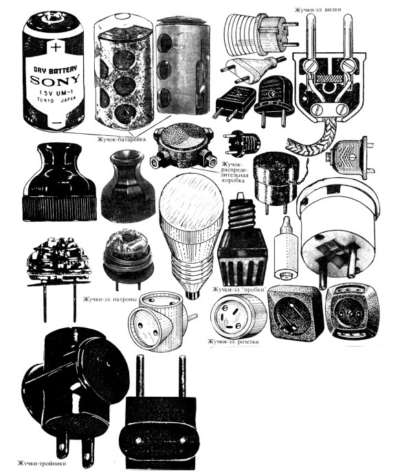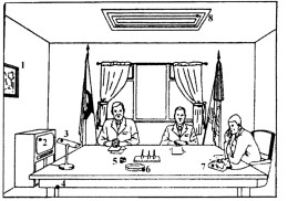 Жучки, выполненные в виде различных электропринадлежностей. Возможные места установки подслушивающих устройств в комнате: 1 — на обратной стороне картины; 2 — в телевизоре; 3 — в настольной лампе; 4 — в ножке стола; 5 — в зажигалке; 6 — в пепельнице; 7 — в телефонном аппарате; 8 — в лампе дневного света