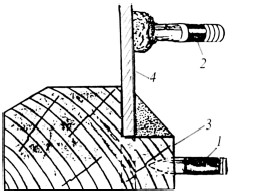 1 — пуля — радиомикрофон в оконной раме; 2 — пуля — радиомикрофон на стекле; 3 — оконная рама; 4 — оконное стекло