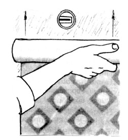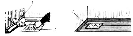 Рис. 67. Установка жучка в подпольное вентиляционное отверстие: 1 — снятая напольная вентиляционная решетка; 2 — устанавливаемый жучок; 3 — напольная вентиляционная решетка, поставленная на место