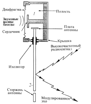 Принцип его работы таков: активный передатчик радиосигнала, установленный за пределами прослушиваемого помещения (обычно в соседнем здании), посылает высокочастотное направленное радиоизлучение на стержень, а отразившаяся модулированная частота (радиоэхо) поступает на приемник-дешифратор.