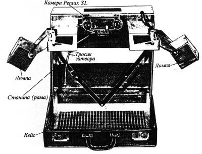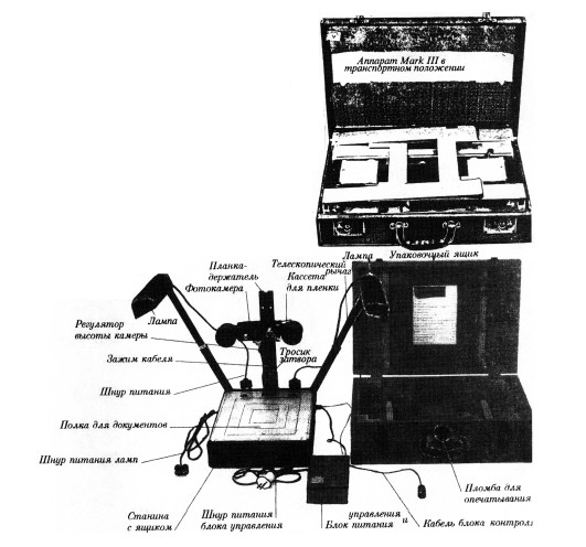 На рисунке 104 — фотокопировальный аппарат (в кейсе) агентов ЦРУ «Mark III» в транспортном (справа) и рабочем (слева) положениях. Он состоит из складной алюминиевой рамы, на которой крепятся две электролампы на шарнирах, работающие от 90В батареи или внешнего 110В — 220В источника (через внутренний выпрямитель) и фотоаппарат Pentax SL с 35-мм пленкой Kodak Panatomic-X. Аппарат работает совершенно бесшумно и позволяет переснимать оригиналы размером до 25 х 35 см.