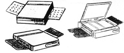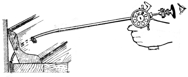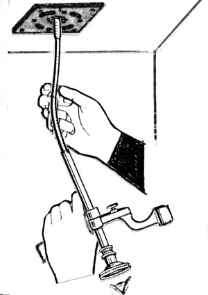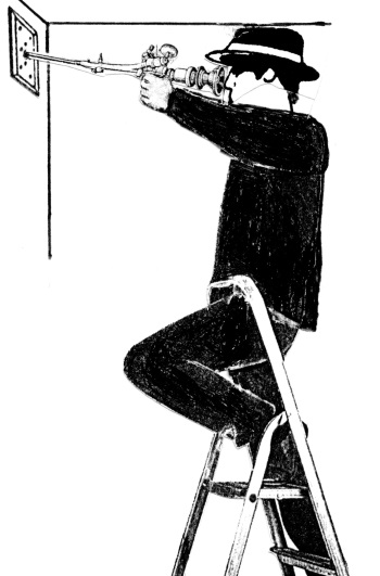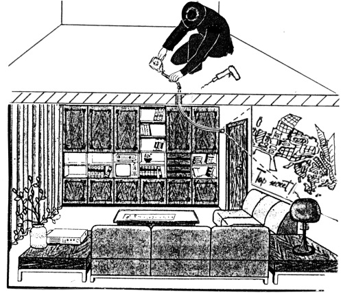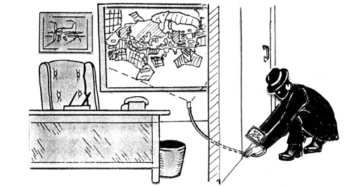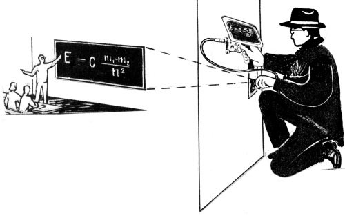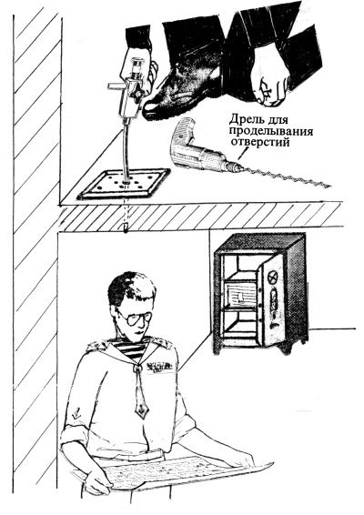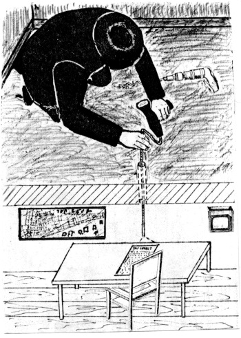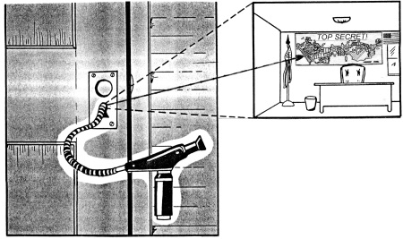 На рисунках показаны некоторые модели фиберскопов и их проникновение в различные отверстия: рис. 109 — сквозь замочную скважину — для съемки карты на вертикальной стене; рис. 110 — сквозь потолок (через заранее просверленное отверстие) — для съемки документов на столе и карты на стене; рис. 111 — сквозь вентиляционное отверстие в стене; рис. 112 — то же в потолке; рис. 113 — сквозь замочную скважину для съемки текста с доски в аудитории; рис. 115 — различные виды фиберскопов (с окулярами для наблюдения и телеэкранами); рис. 116 — в щель между дверями и полом для съемки карты на стене; рис. 117 — в заранее просверленное отверстие в потолке — для съемки карты на стене; рис. 118, 119 — в проделанное заранее отверстие — для наблюдения за помещением нижнего этажа. Понятно, что все отверстия должны быть подготовлены заранее. Иногда для этой цели арендуется соседнее помещение, в котором имитируется ремонт, притупляющий внимание охраны к шуму, и «под шумок» позволяющий сделать необходимое отверстие.