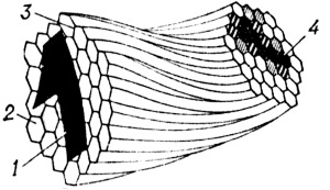 Рис. 108. Поэлементная передача изображения волоконной деталью: 1–изображение, поданное на входной вогнутый торец; 2– светопроводящая жила; 3–изолирующая прослойка; 4–мозаичное изображение, переданное на входной торец