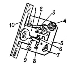 Рис. 122. Бессувальдный замок с ключом 1–ригель (засов); 2–собачка; 3–запорный паз;4–пружина собачки;5–основание корпуса; 6–бородка ключа;7–распорная стойка; 8–ключевина;9–стойка крепления; 10–лицевая планка.