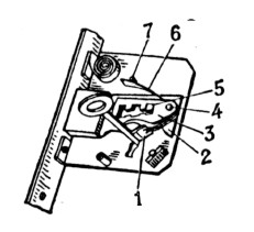 Рис. 123. Двухоборотный сувальдный замок с ключом 1–бородка ключа с прорезями для сувальд; 2–ригель;3–сувальда с просечкой под запорную стойку; 4–ось; 5–запорная стойка; 6–пружина сувальды; 7–упорный штифт.