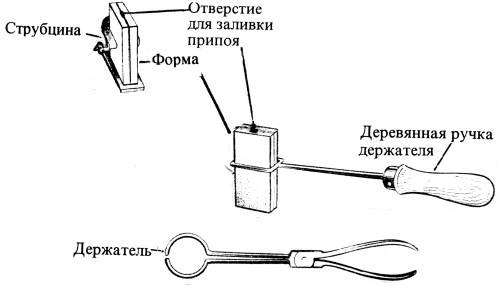 а — форма; б — формовочная глина; в — пробирка с тальком; г — наперсток; д — держатель; е — припой; ж — свеча.