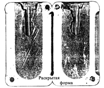 2) закрыть крышку формы и с силой сжать обе половинки;