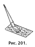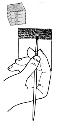 Написанный деревянным (рис. 198) пером (желательно печатными буквами) этими чернилами (на хорошей бумаге, используемой в данной стране) текст становится невидимым при высыхании. Писать следует осторожно, так как возможные «задиры» бумаги могут насторожить почтовых цензоров на предмет наличия скрытого сообщения. Высохшую бумагу следует разгладить и (для устранения возможного коробления) поместить между страницами толстой книги, дополнительно пригрузив ее, например, другими книгами (рис. 199). Поверх невидимого текста набрасывается малозначительный текст обычными чернилами.