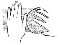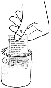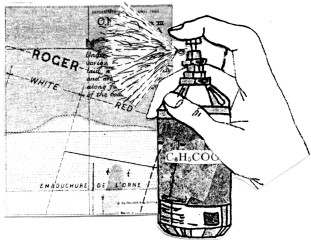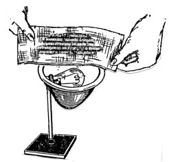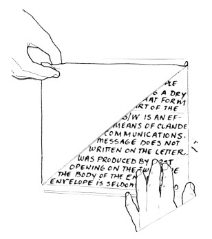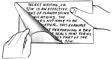 Понятно, что различные симпатические чернила требуют своих способов написания и проявления: некоторые становятся видимыми (или, наоборот, невидимыми) при погружении листа с текстом в обычную воду (рис. 210), другие становятся невидимыми при наложении на них платка (ткани) пропитанного одним составом (рис. 211) и проявляются другим (рис. 212).