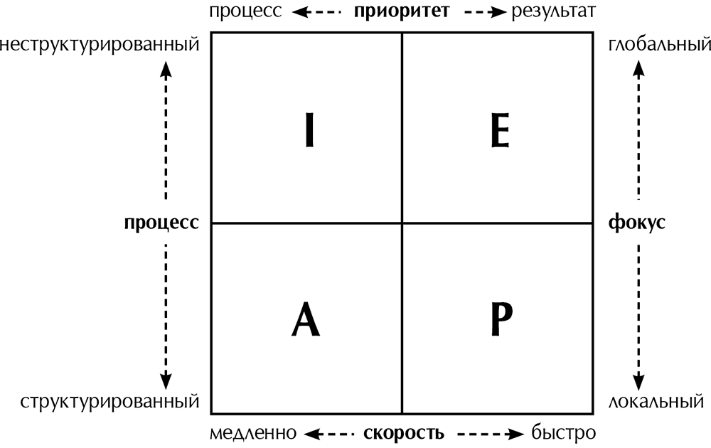 Рассматривая схему, мы видим, что четырем квадрантам окна соответствуют четыре (PAEI) – стиля – производитель, администратор, предприниматель и интегратор, – наряду с четырьмя типажами, представляющими неправильный менеджмент.