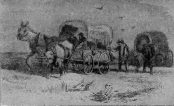 Переселенцы в пути на Дальний запад. Современный рисунок.