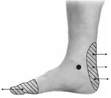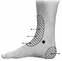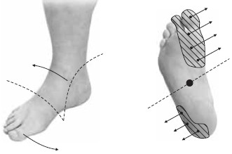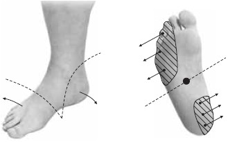 Усилие разделяет стопу пополам, как и в ключе 11. Связано оно с верхней частью стопы (подъем), которая устремляется вверх, пытаясь оторваться от подошвы, будто вы стремитесь оторвать от пола приклеенную стопу. Точки ментальной фиксации находятся на условной линии, разделяющей стопу посередине. Задерживайтесь в каждом положении на 30 секунд, постепенно наращивая усилие (фото 29).