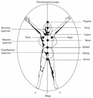 Рис. 1. Поселенный пузырь человека. Ядра сознания и энергетические центры