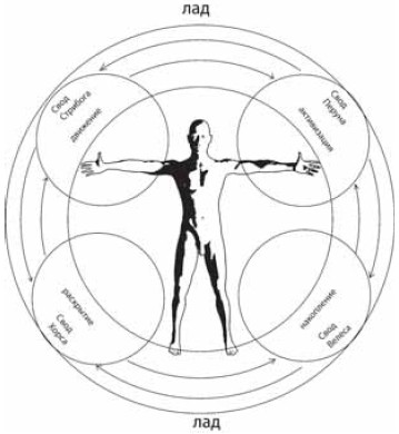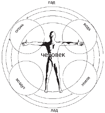Выше говорилось, что человек, как и все сущее, по представлениям наших предков состоит из четырех начал: Земли, Воды, Огня и Воздуха, находящихся в динамическом равновесии – Ладе (рис. 6).