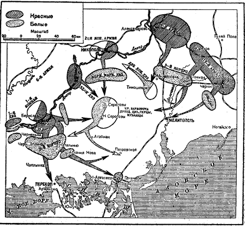 Зажатый красными в клещи, раскрытые концы которых начинались, с одной стороны, у Херсона (6-я армия) и, с другой — у Бердянска (13-я армия), враг оказывался отрезанным от перешейков, а в лоб ему били конные части и 4-я армия.