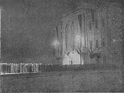 Ночь накануне похорон. Трудящиеся перед Домом союзов идут прощаться с М. В. Фрунзе.