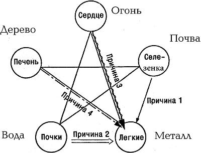 Во многих случаях патология легких (рис. 13) является прямым следствием нарушения эмоционального и физического равновесия стихии Металла. Однако та же болезнь легких может быть вызвана и дисбалансом селезенки («Мать не дает Ребенку достаточно пищи»). Это может произойти и вследствие болезни почек («Ребенок отбирает энергию Матери»). Нарушения в стихии Огня – болезни сердца и атеросклероз – могут вызвать заболевание легких («Бабушка слишком строга с Внуком»). И, наконец, они могут развиться при дисбалансе Дерева («Внук не подчиняется Бабушке»).