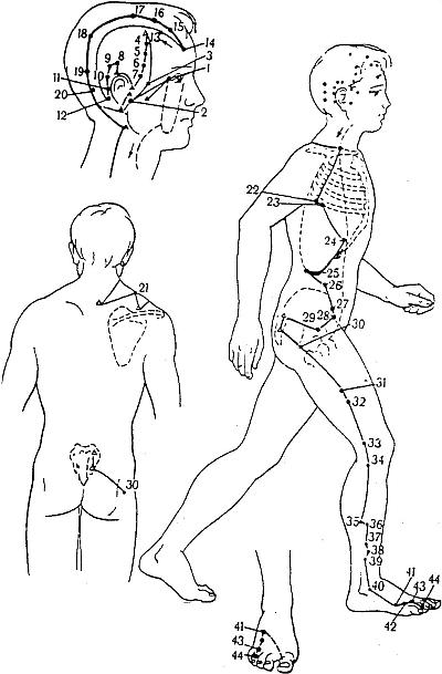 Синдром жара: ощущение жара, головная боль, чередование озноба и лихорадки, раздражительность, возбужденность, плохой сон, шум в ушах, глухота, горечь во рту, увеличение лимфатических узлов по ходу канала (рис. 15).