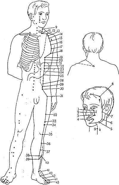 Для стимуляции энергии в желудке воспользуйтесь легким массажем точек начала и конца меридиана желудка (рис. 22).