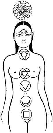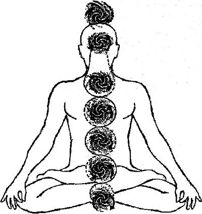Точки пересечения трех главных токов образуют некие токовые поля, именуемые чакрами (рис. 11). Более правильно было бы называть чакры «колесами», «кругами» или «центрами». Чакры являются некими энергетическими и мысленными круговоротами, вихрями, в которых на своем пути к Освобождению вертится в кругу забот сознание, как щепка в водовороте или как белка в колесе. Часто употребляемое выражение «раскрытие чакр» неверно. Упанишады уподобляют чакры лотосам или указывают, что лотосы находятся в чакрах. У непробужденного человека эти лотосы не раскрыты, но раскрываются упражнениями, а чакры «пронзаются» или «рассекаются», как помехи на пути к совершенству. Пребывание сознания на уровне той или иной чакры является знаком достижения определенной ступени духовного развития.