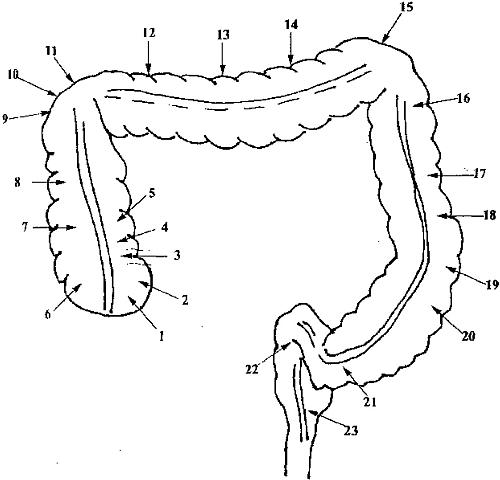 Проекция анатомических органов на толстую кишку по N. Walker 1 – рефлекс переваривания пищи; 2 – синус; 3 – евстахиева труба; 4 – глаза, уши; 5 – рефлекс пищеварения; 6 – тимус; 7 – молочные железы; 8 – щитовидная железа; 9 околощитовидная железа; 10 – печень; 11 – желчный пузырь; 12 – сердце; 13 – легкое и бронхи; 14 – желудок; 15 – селезенка; 16 – поджелудочная железа; 17 – надпочечники; 18 – почки; 19 – половые железы; 20 – яичники; 21 – мочевой пузырь; 22 – половые органы (мужские и женские); 23 – предстательная железа.