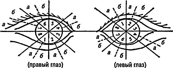 Правый глаз: 1а – легкое, 1б – толстая кишка; 2а – почки, 2б – мочевой пузырь; 3 – верхний обогреватель; 4а – желчный пузырь, 4б – печень; 5 – средний обогреватель; 6а – тонкая кишка; 6б – сердце; 7а – желудок, 7б – селезенка; 8 – нижний обогреватель. Левый глаз: аналогично.