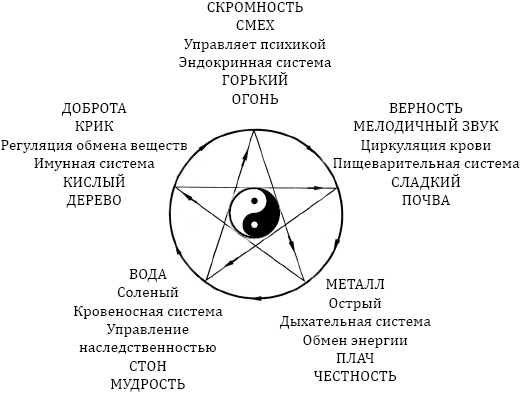 Система первоэлементов употребляема в любой сфере деятельности и широко применяется в восточной медицине. Благодаря классификации, отображенной в табл. 1, можно определить, в какое время года лучше заниматься лечением и профилактикой того или иного заболевания, какими вкусовыми ощущениями нужно руководствоваться при определении диеты, какое эмоциональное состояние нужно поддерживать и так далее (рис. 5). При нарушении, проявляющемся на одном из уровней, необходимо найти, дисбалансом какой стихии оно вызвано, затем определить необходимую для усиления стихию. Далее, благодаря эмоциям, вкусам, движениям и органам, связанным с последней стихией, можно гармонизировать организм. Часто усиление самой заболевшей стихии приносит только вред, поэтому внимательно изучите циклы порождения и угнетения, описанные дальше. Используя данное соотнесение со стихиями, мы можем анализировать не только явления окружающего мира, но и физиологии человеческого организма, для объяснения взаимосвязи внутренних органов, а также для диагностики и лечения различных заболеваний.