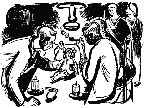 Игрушки пошли но рукам. Младший помощник посадил полисмена на сахарницу, щелкнул по носу и дал ему в рот папиросу. Полисмен яростно вертел злым бисерным глазом. Штерн заспорил с Чохом о парусных корабликах. Чох утверждал, что это модели чайных клиперов. Штерн сердился и доказывал, что это бриги. Вытащили книги с описаниями старинных кораблей. Радист сел за пианино, и кукла-пионер под опытной рукой механика начала отплясывать чечетку. В двери заглядывали ухмыляющиеся матросы. Боцман пришел доложить относительно скорости хода, взял со стола свистульку и показал на ней все двенадцать соловьиных колен.