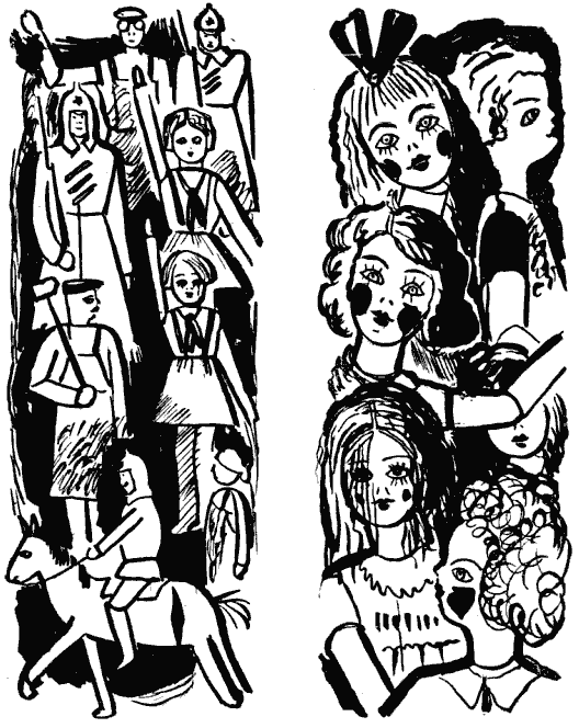 Чудак перебил Штерна и сказал, что в игрушки вкладывается много таланта и теплоты, должно быть, потому, что игрушечные мастере прожили незавидное детство. Ребенок, не знающий игрушек, растет в сухом окружении взрослых. Он даже не может разговаривать с паровозами и зайцами и не может проделать самую заманчивую вещь – отвертеть голову полисмену и заглянуть внутрь, в полый гипсовый шарик,