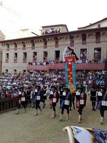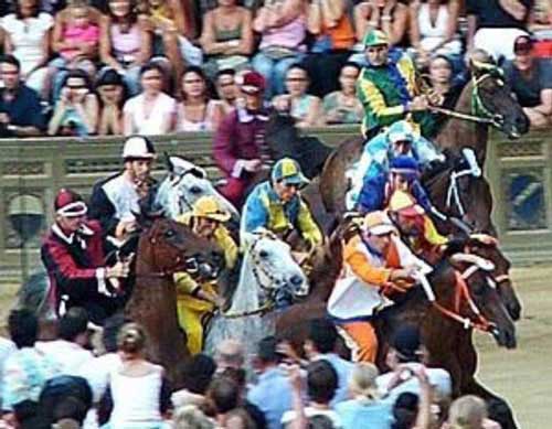 Кони с раскрытыми мордами, подгоняемые всадниками, несутся по дороге, окружающей раковину площади. Некоторые всадники держат хлысты, другие — громадные бичи из бычьих жил — не столько для своего коня, сколбко для соперников. Бывает, что бьют настолько сильно, что на теле надолго остается красная полоса. Всадники впадают в какой-то экстаз, в безумие, пока не начинают размахивать своими плетями вслепую, без какого-либо милосердия. Ведь на кону честь «контрады»! И подумать только, что в 1581 году, во время этой скачки с бичеванием победила молодая девушка, Виргиния из «контрады» Дракон. Старинные китайские хроники рассказывают, что лошадей ферганской («ferghana») породы, на которых ездили посланцы вдоль Великой Китайской Стены, заставляли мчаться с такой скоростью, что те потели кровью. Чтобы здесь происходило подобное, дистанция слишком мала. Всего лишь один круг. Всего лишь полутораминутная скачка.