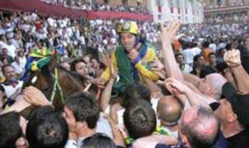 Триумфаторы получают огромное знамя, называемое Il Palio. Именно от него и взяли названия сиенские игры, которым уже более пятисот лет. Победившая «контрада» парадом проходит по городу. Ее пожилые и молодые члены плачут от радости. Ее название будет записано в муниципальных книгах — ради вечной памяти о событии. Конь завоевавший для нее эту славу, становится гордостью и любовью для «контрады». Конь — в Италии это звучит очень гордо.