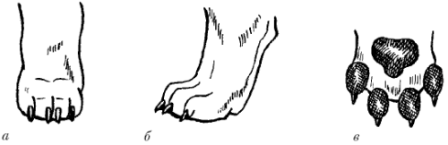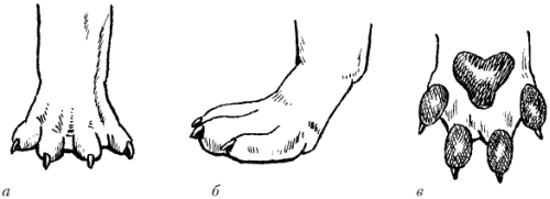 Нормально развитая лапа: а – вид спереди; б – вид сбоку; в – вид с внутренней стороны