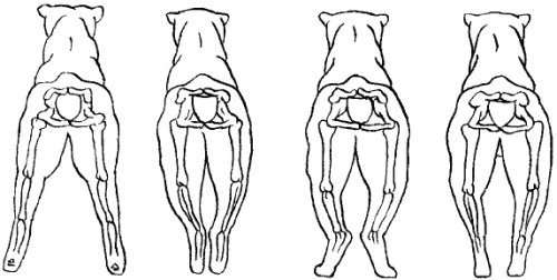 От угла наклона таза зависят плавность и слаженность движений собаки при перемещении вперед. Если таз располагается перпендикулярно к спине, то при отталкивании от поверхности земли он будет приподниматься вверх. При наклонном же поставе таза давление корпуса собаки будет направлено непосредственно на крестец, а затем на позвоночный столб, и таким образом животное станет перемещаться вперед без резких толчков и рывков.
